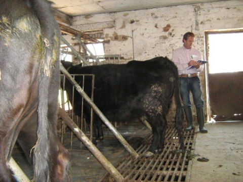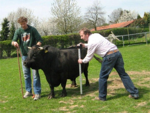 In het voorjaar van 2010 heeft een tweede keuringsronde plaatsgevonden. De keurmeester neemt hier de maat van de fokstier Boerhoes Brutus.